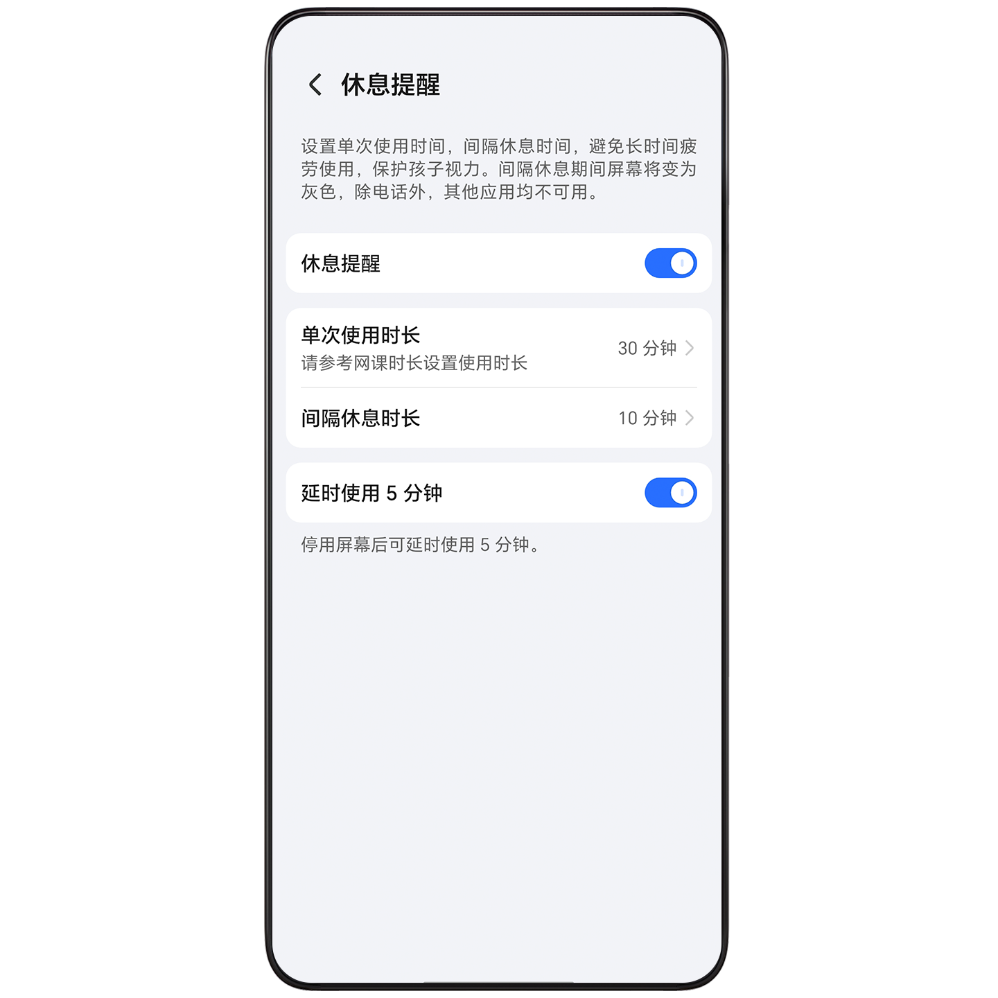 可以设置单次使用时长和间隔休息时长,还可以开启延时使用 5 分钟,当到达屏幕停用时间时,还可多使用 5 分钟。