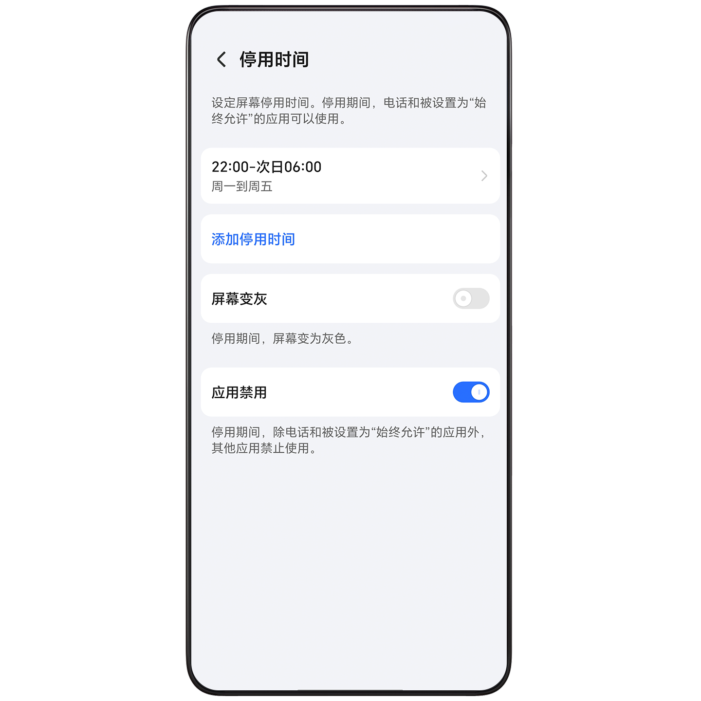 你可以按需为孩子设置当前手机/平板的可用时长、休息提醒、限制应用的使用时间和禁用时段。