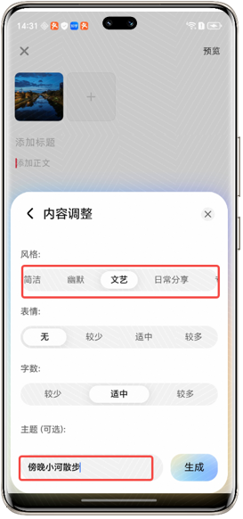 可根据需要选择合适的风格,同时可在主题输入区域进行提示: