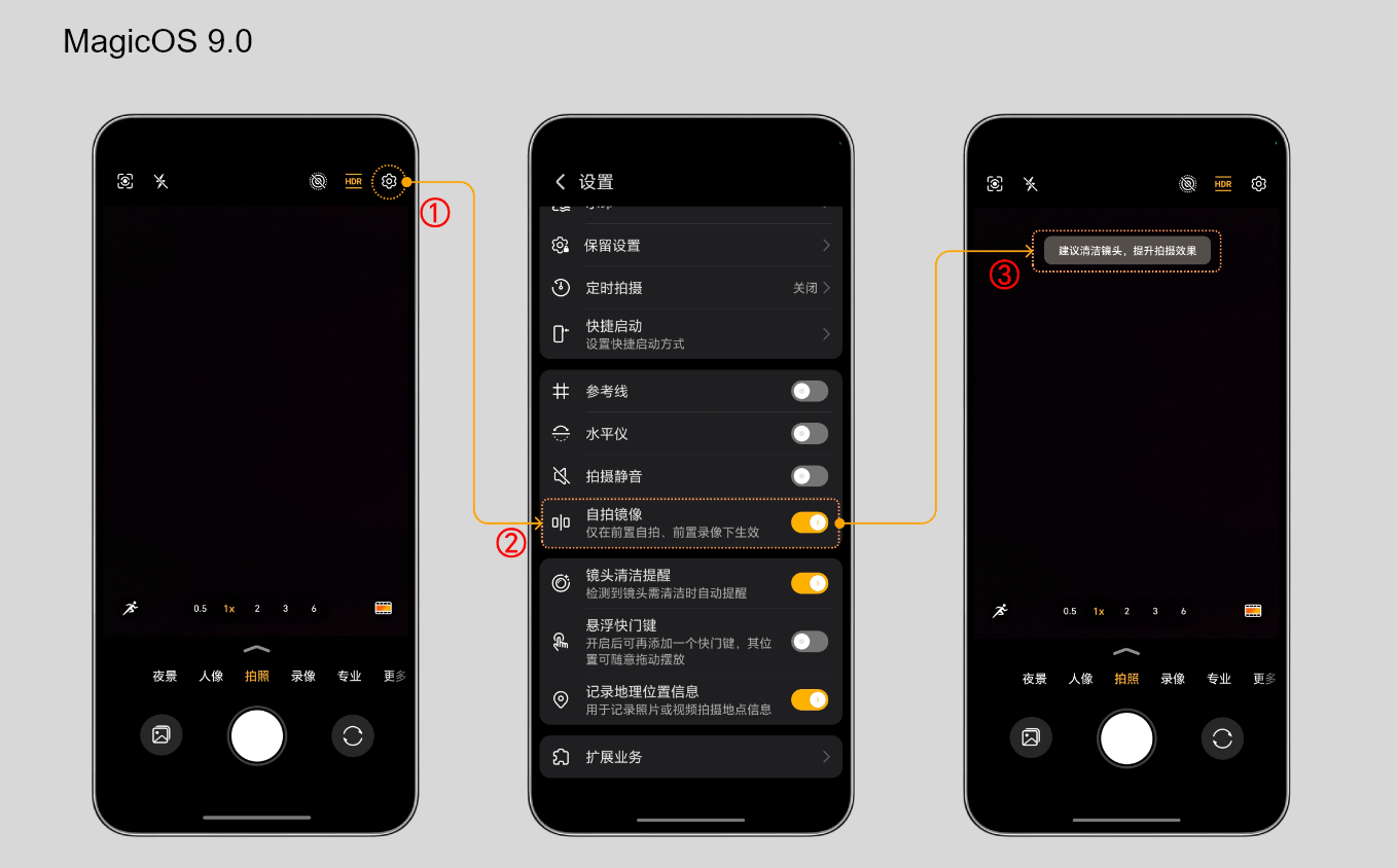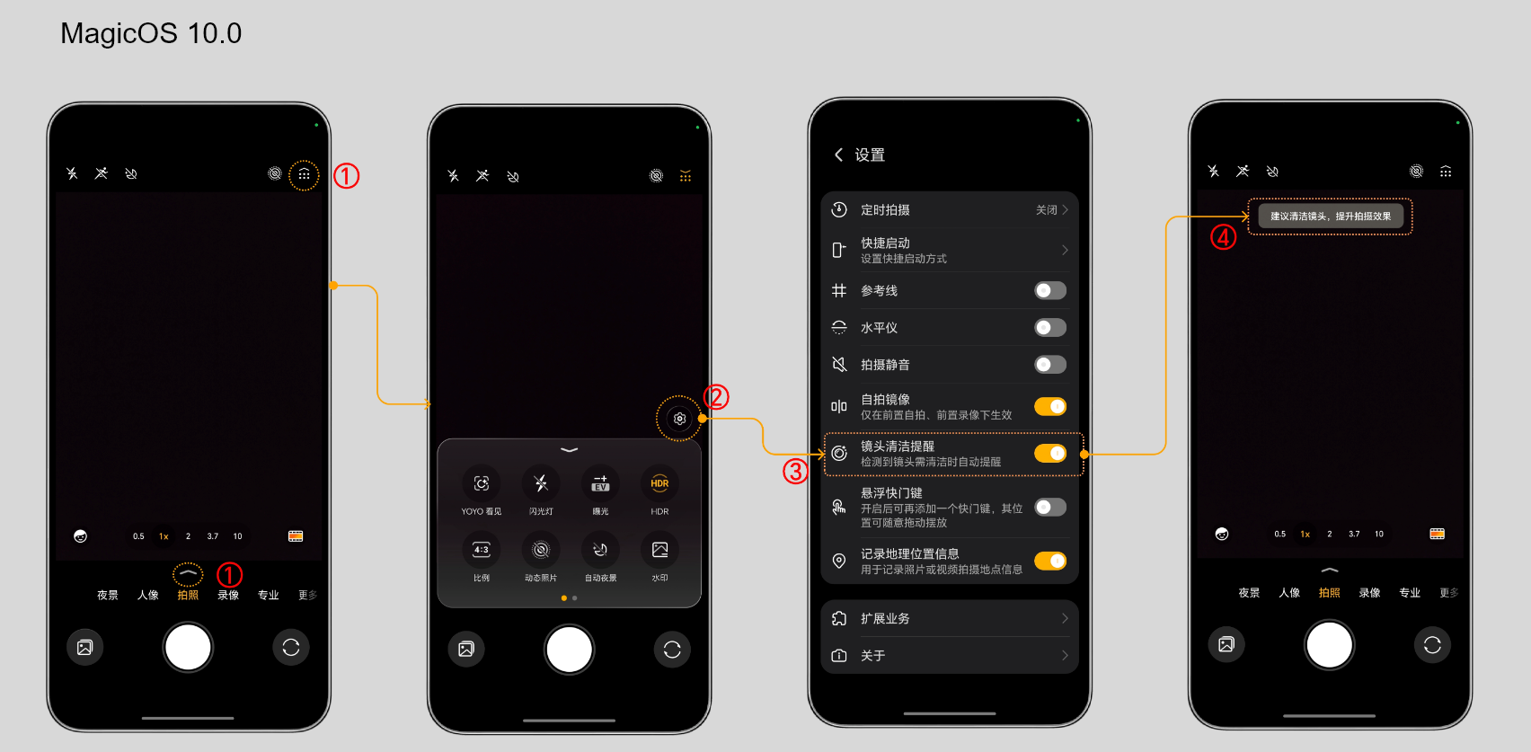 可以通过以下路径找到“镜头清洁提醒”选项并开启。当镜头自动检测到脏污后,拍摄界面会出现“请保持镜头清洁,提升拍摄效果”提示语。