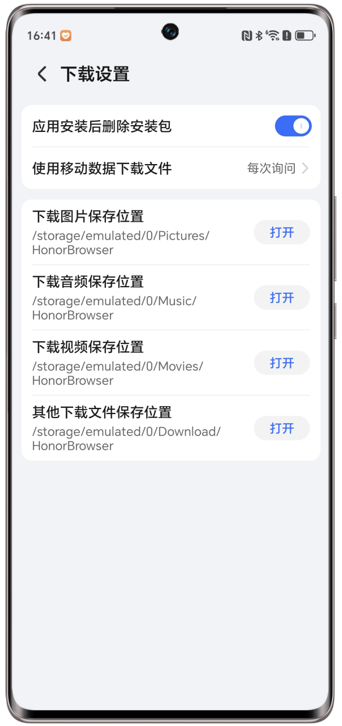 荣耀浏览器>我的>右上角>下载设置或荣耀浏览器>我的>下载>右上角,进入下载设置详情页后,点击对应下载文件存储位置的打开按钮,即可跳转至文件管理中查看您已下载的文件。