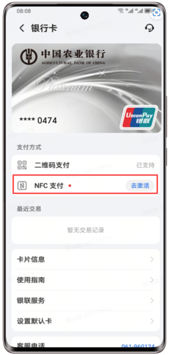 - 若之前未绑定过银行卡,若所属银行支持开通NFC支付,完整绑卡时会自动开通NFC支付功能,无需单独操作激活。