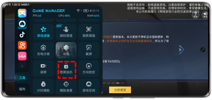 游戏管家悬浮窗>工具>熄屏挂机