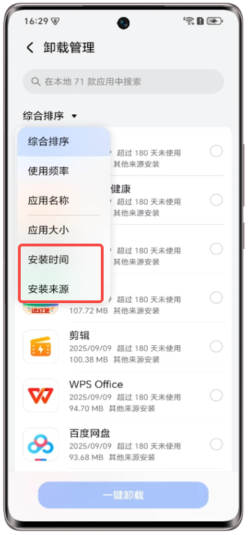 方法2:进入应用市场>我的>卸载管理,按安装来源 或 安装时间排序,检查是否有其他来源安装的恶意应用,选中后点击一键卸载。如果无法卸载,按照下方卸载恶意应用操作卸载。