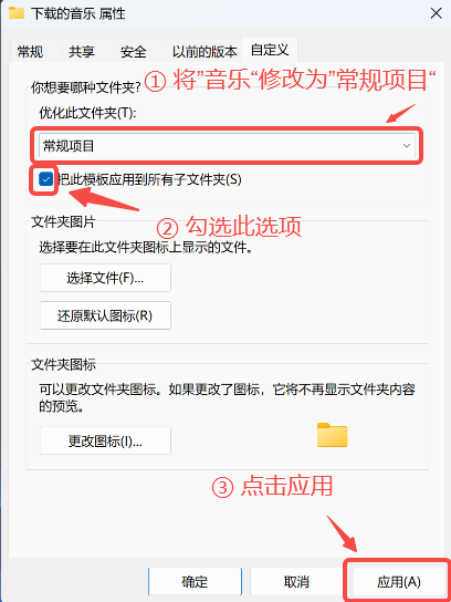 在自定义栏点击“优化此文件夹”,将其从“音乐“修改为”常规项目”,勾选”把此模板应用到所有子文件夹“,最后点击应用,即可完成设置。