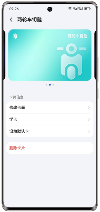 打开荣耀钱包 > 卡包 > 我的卡 > 卡片列表,选择需要删除的两轮车钥匙,进入卡片详情,点击“删除卡片”按提示操作。