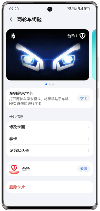 2、若已创建两轮车钥匙,请打开两轮车钥匙卡片详情页,点击“学卡”并按学卡教程指引打开车辆的学卡模式。