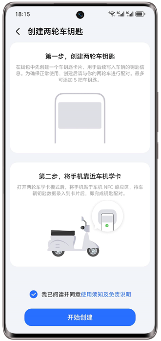 1、若未创建两轮车钥匙,请先进入荣耀钱包App,创建对应品牌的两轮车钥匙,