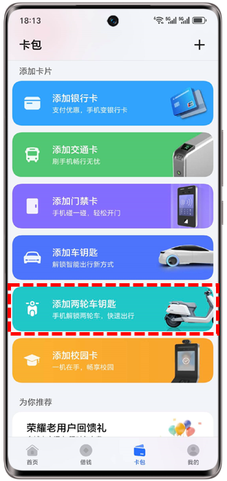 开通路径:荣耀钱包App > 卡包 > 添加两轮车钥匙,选择对应电动车品牌,添加钥匙。
