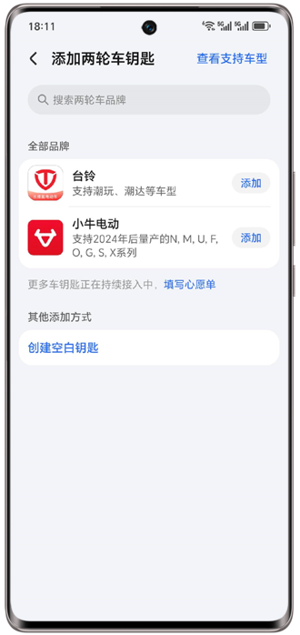 打开荣耀钱包App > 卡包 > 添加两轮车钥匙,在列表页选择对应电动车品牌,按照指引添加,创建车钥匙卡片。若未找到您要的品牌,也可以通过“创建空白钥匙”进行添加。