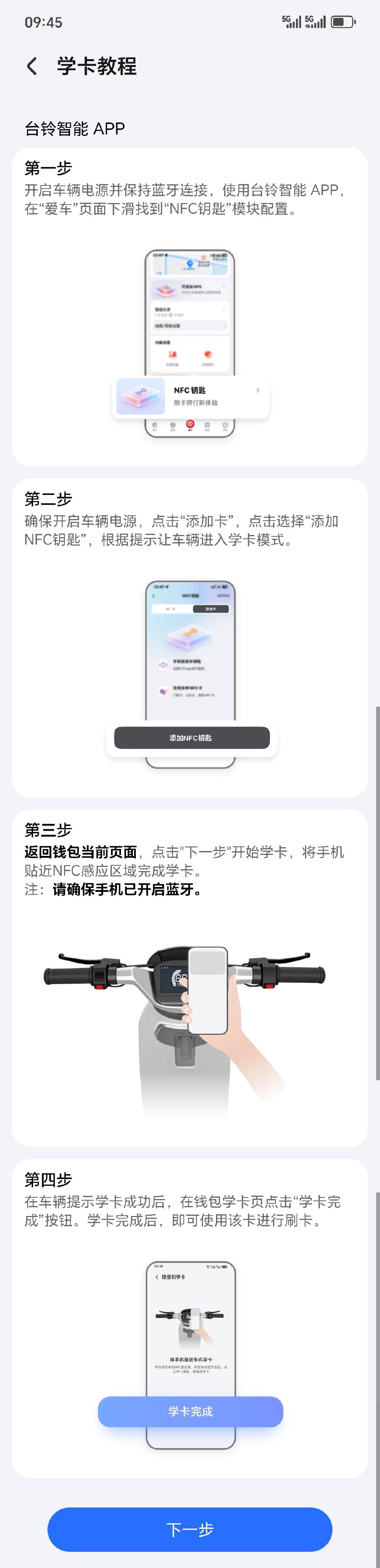 - 在钱包完成学卡后,请再返回台铃APP完成后续操作,以保证两轮车钥匙添加成功。