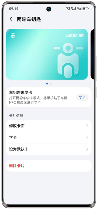 - 检查两轮车钥匙是否已完成学卡。进入荣耀钱包App >卡包,点击已添加的两轮车钥匙,如未学卡,请点击学卡按钮,按照指引进行学卡,完成学卡操作后重试。如已学卡,可以按照学卡指引重新操作学卡后再尝试刷卡,避免前次学卡时未有效配对;