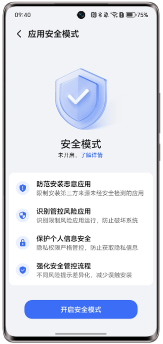 (1)请您打开系统设置>搜索“应用安全模式”,点击底部按钮“开启安全模式”。