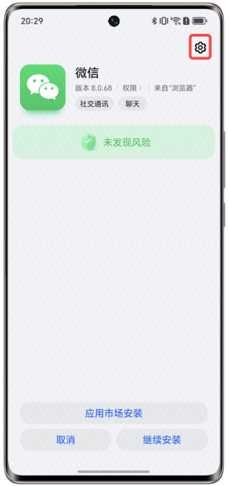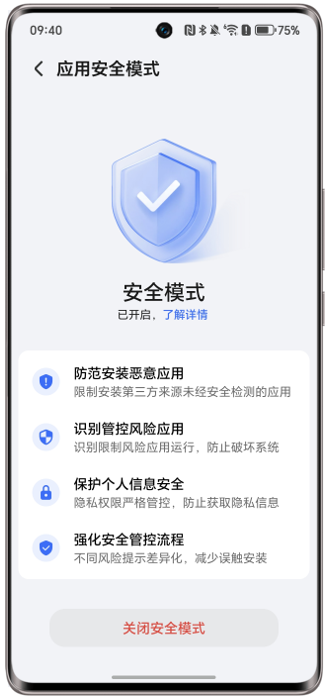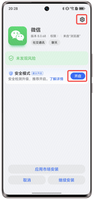 (2)在应用安装页面,点击右上角>安全模式“已开启”按钮>关闭安全模式。