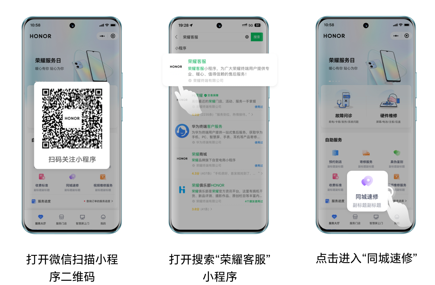 方式一:通过“荣耀客服”小程序下单,体验同城速修业务