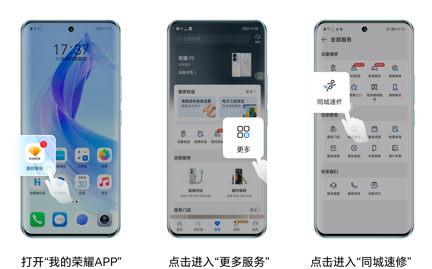 方式二:通过“我的荣耀”APP下单,体验同城速修业务