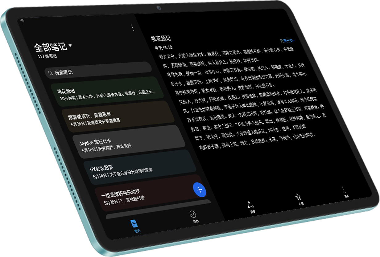 搭配手写笔13,无论是写作业、记笔记,还是涂涂画画都得心应手,支持全局手写14与提笔速记15,随时随地记录灵感