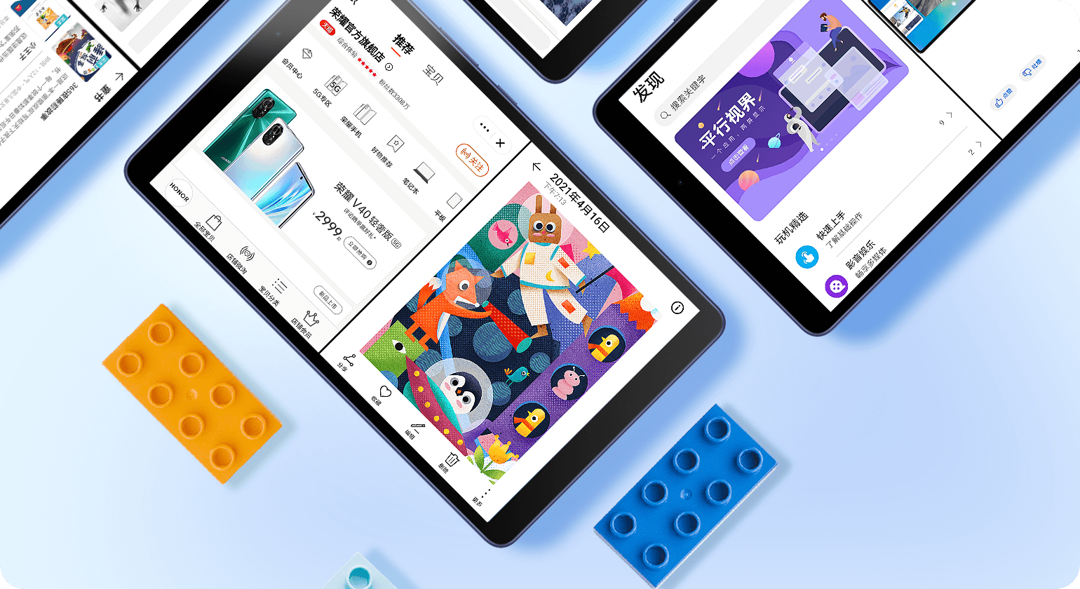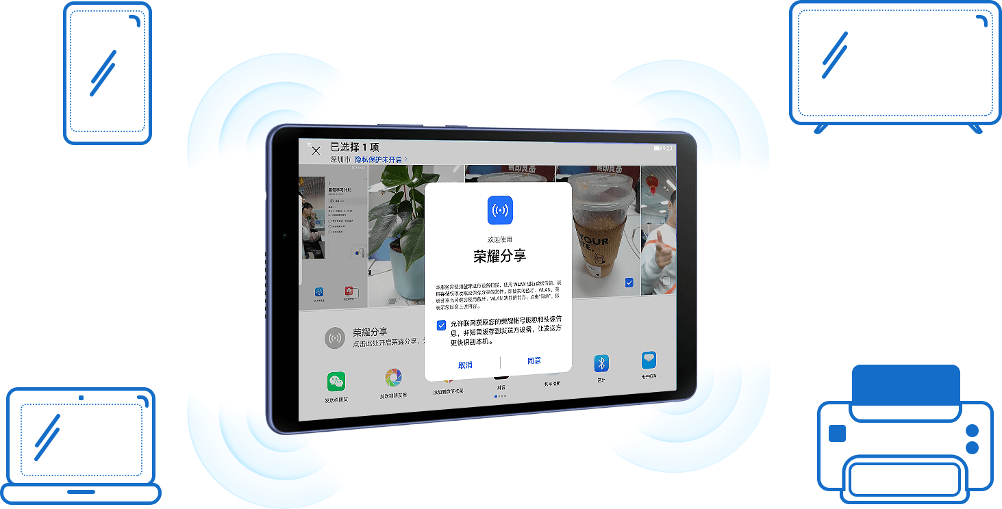 使用HONOR Share,手中的平板可以在荣耀手机、荣耀笔记本、打印机等设备之间