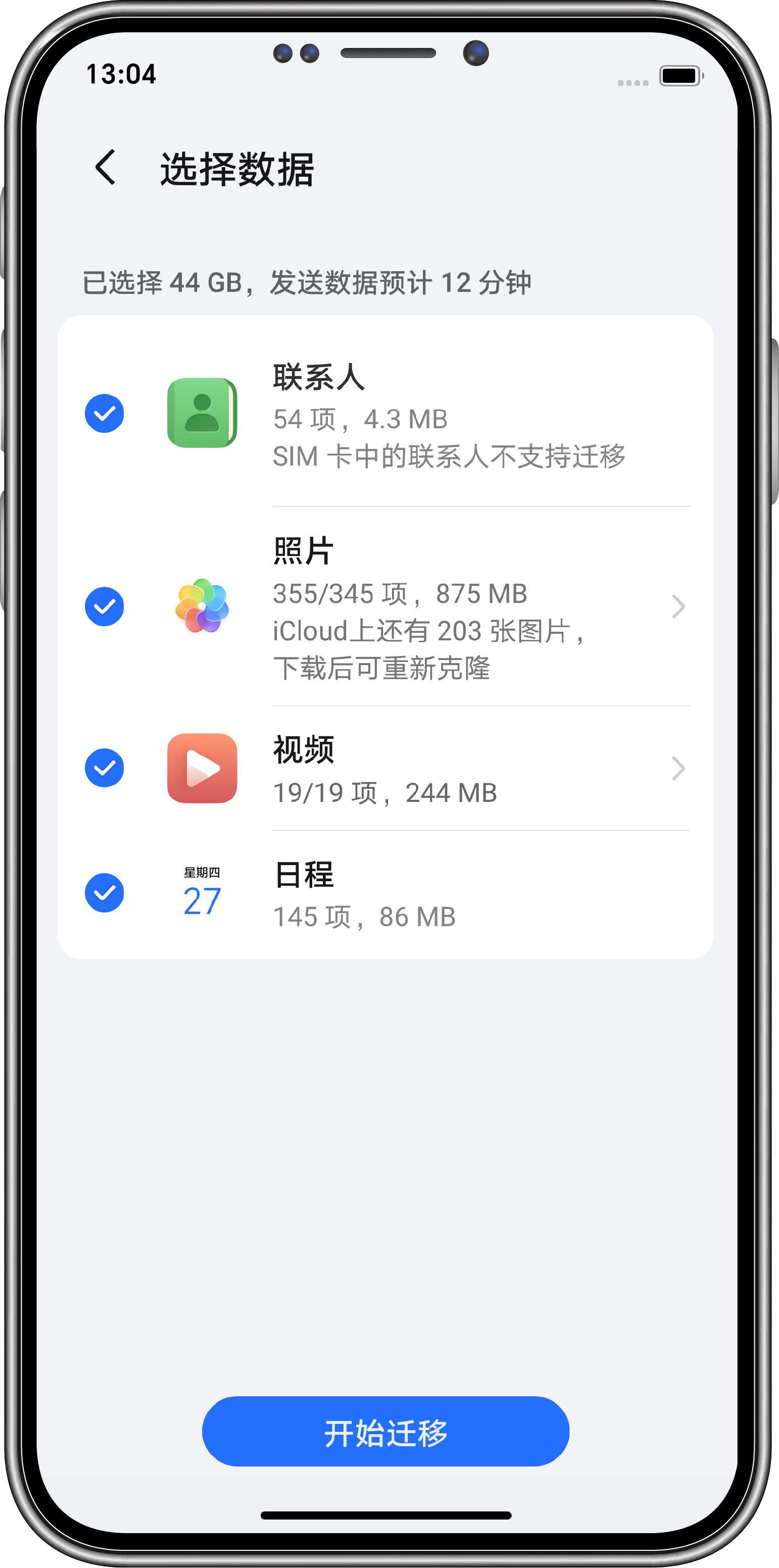 - 应用数据迁移功能仅支持官方渠道安装的应用,部分应用暂不支持数据迁移,请以新机迁移界面为准。