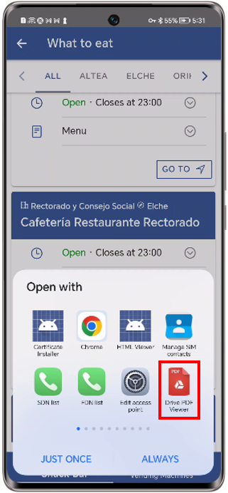 Por ejemplo, el usuario no puede abrir menu_bon_menjar_rectorado en la UMH y no puede seleccionar otras apps para abrirlo.