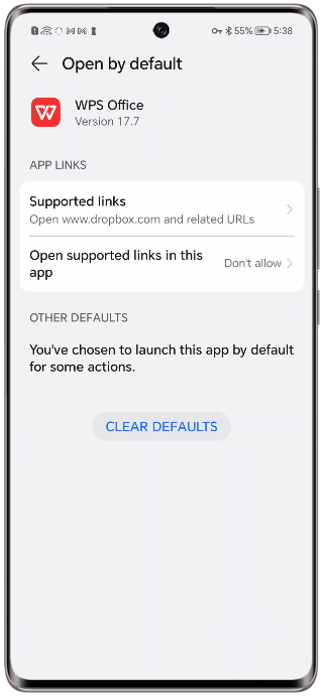 - Vaya a Ajustes > Aplicaciones > Aplicaciones > seleccionar la aplicación predeterminada (en este caso, WPS Office) > Abrir