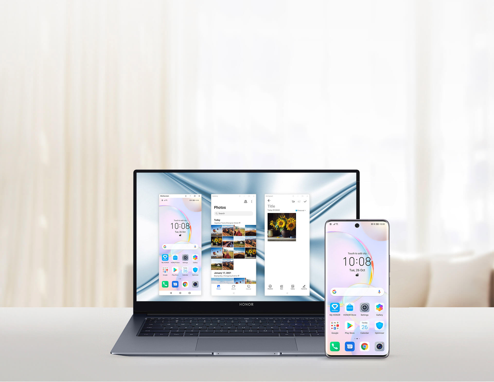 Spolupráce na více obrazovkách4 vám umožňuje sdílet obrazovku a soubory chytrého telefonu na notebooku HONOR MagicBook X 14 a upravovat je pomocí téže klávesnice a myši. Pokračujte přesně tam, kde jste skončili, aniž byste museli přecházet mezi jednotlivými zařízeními.