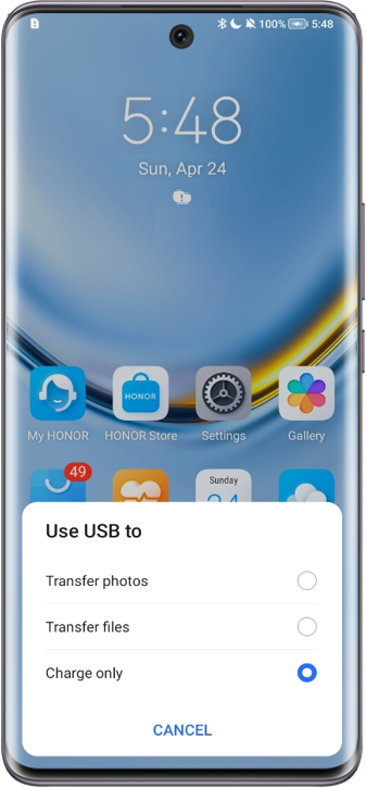 Pokud na telefonu/tabletu není žádná zpráva oznamující správné připojení kabelu USB, kabel nemusí být připojen správně. I když lze zařízení nabíjet, neznamená to, že je kabel USB správně připojen (některé kabely USB například podporují pouze nabíjení, ale ne přenos dat). Musíte proto zkontrolovat, zda se v panelu oznámení zobrazí zpráva (jak je znázorněno níže u příkladu s telefonem). Pokud se zpráva nezobrazí, zkuste kabel znovu připojit, použít jiný port USB, vyměnit kabel nebo restartovat telefon/tablet/počítač.