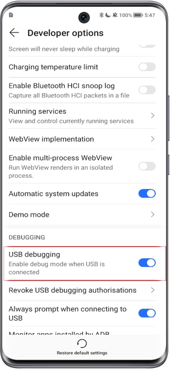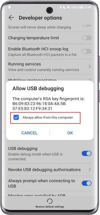- Přejděte do nabídky a zapněte Ladění USB. V okně výzvy zaškrtněte Vždy povolit tomuto počítači ladění.