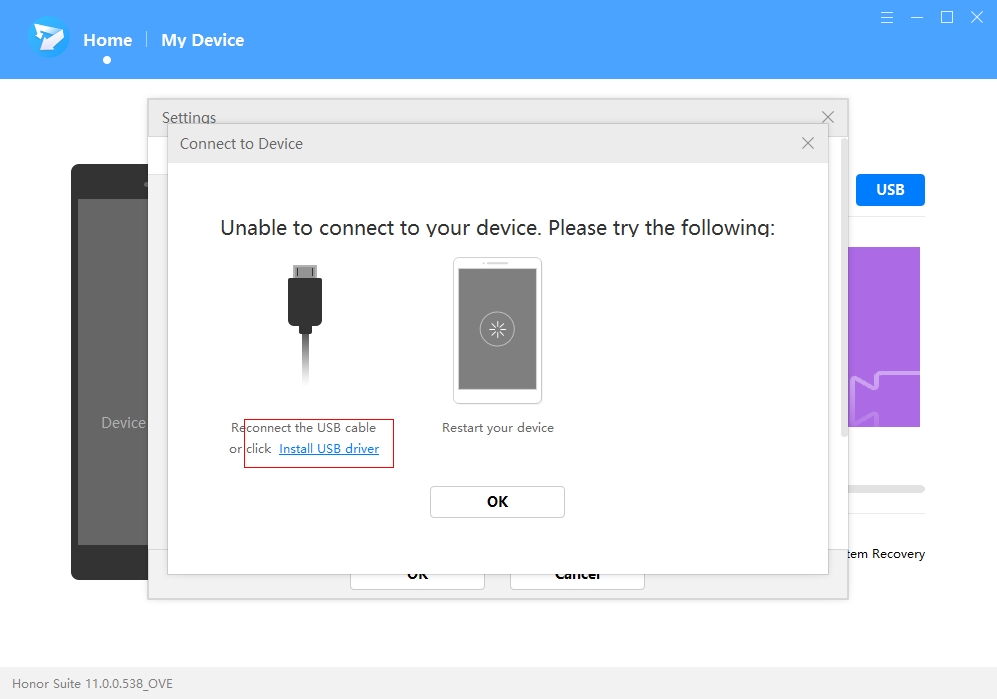 Přejděte do pravého horního rohu a klikněte na Nabídka > Nastavení > Obecná nastavení > Zařízení nelze připojit, klikněte na Další způsoby a v okně „Připojit zařízení“ klikněte na Instalovat ovladač USB.