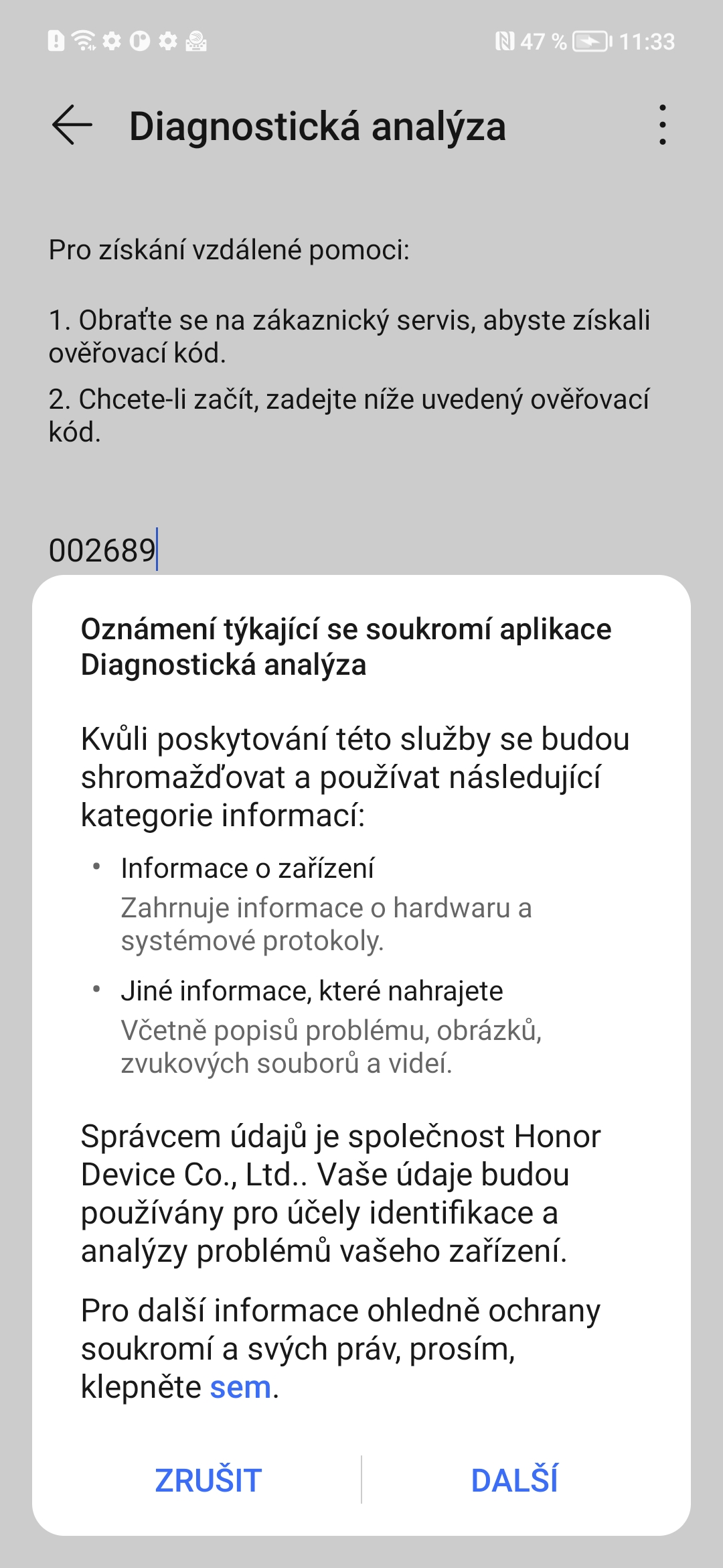 - 3. Zavolejte na zákaznickou podporu společnosti Honor a požádejte operátora o poskytnutí ověřovacího kódu, který je nutný k zahájení vzdálené diagnostiky.