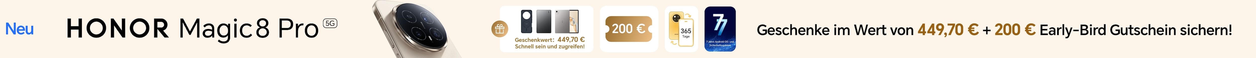 Der Preis für das HONOR Magic8 Lite liegt bei 399€. Dafür bieten wir dir ein außergewöhnliches Preis-Leistungs-Verhältnis: erstklassige Langlebigkeit, einen 7500 mAh Silizium Kohlenstoff Akku, eine 108 MP Kamera, ein 6000 Nit AMOLED Display und leistungsstarke KI Funktionen – alles verpackt in einem schlanken Design von nur 7,76 mm und 189 g.