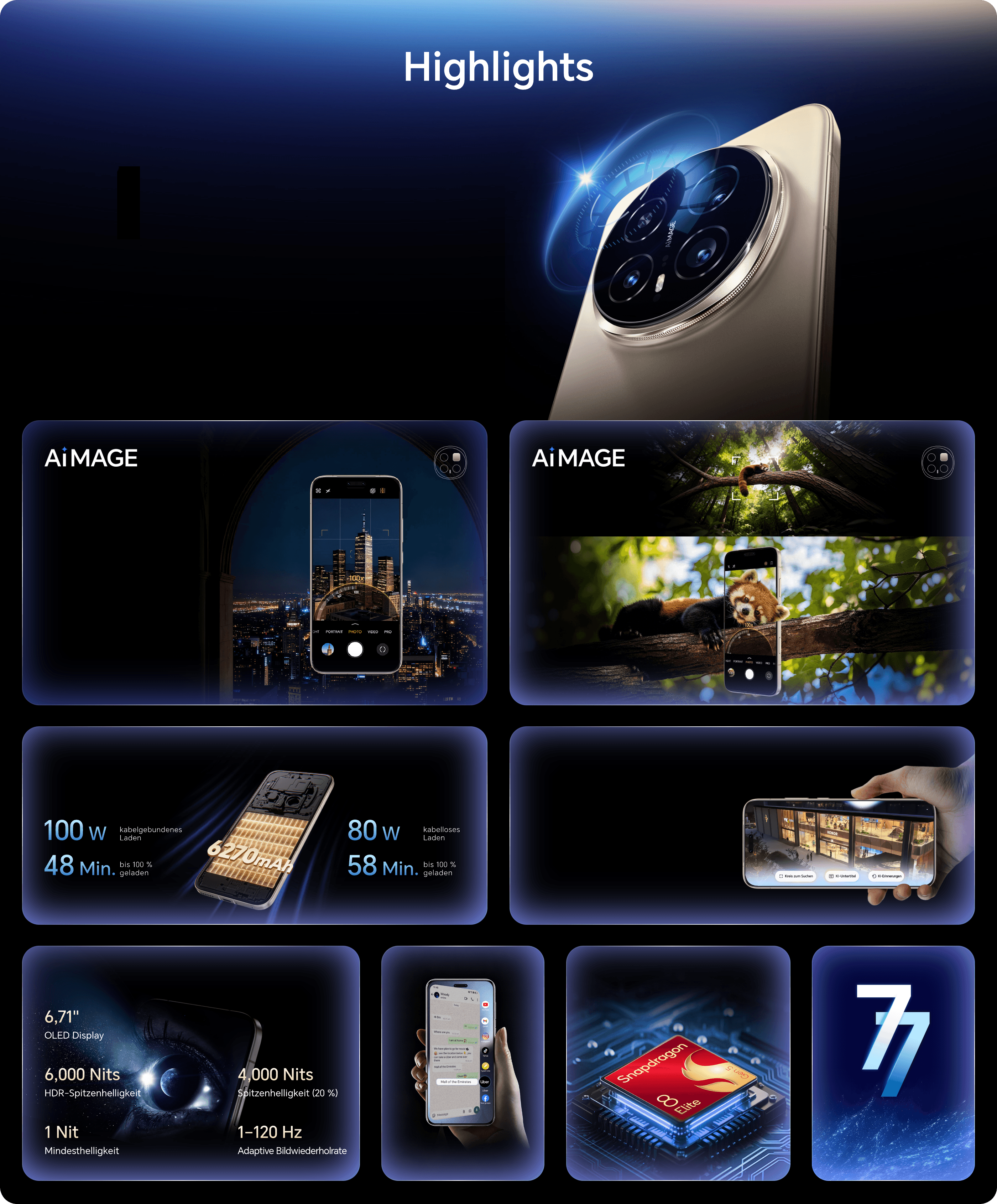 6.270 mAh (typischer Wert) 100W kabelgebundenes & 80W kabelloses HONOR SuperCharge |