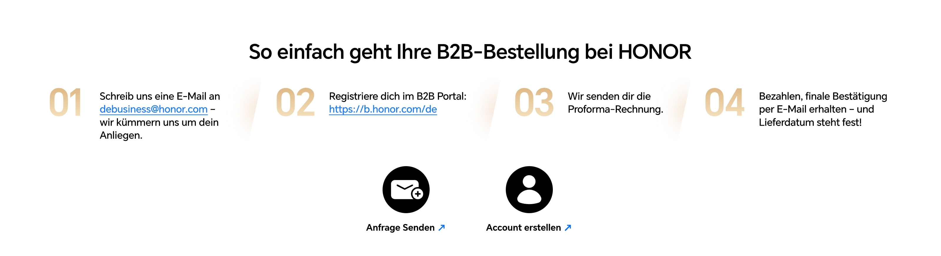 HONOR Business bedient Geschäftskunden mit Procurement-Bedürfnissen, wie Unternehmen und Institutionen. Privatkunden können direkt über den HONOR Store einkaufen.