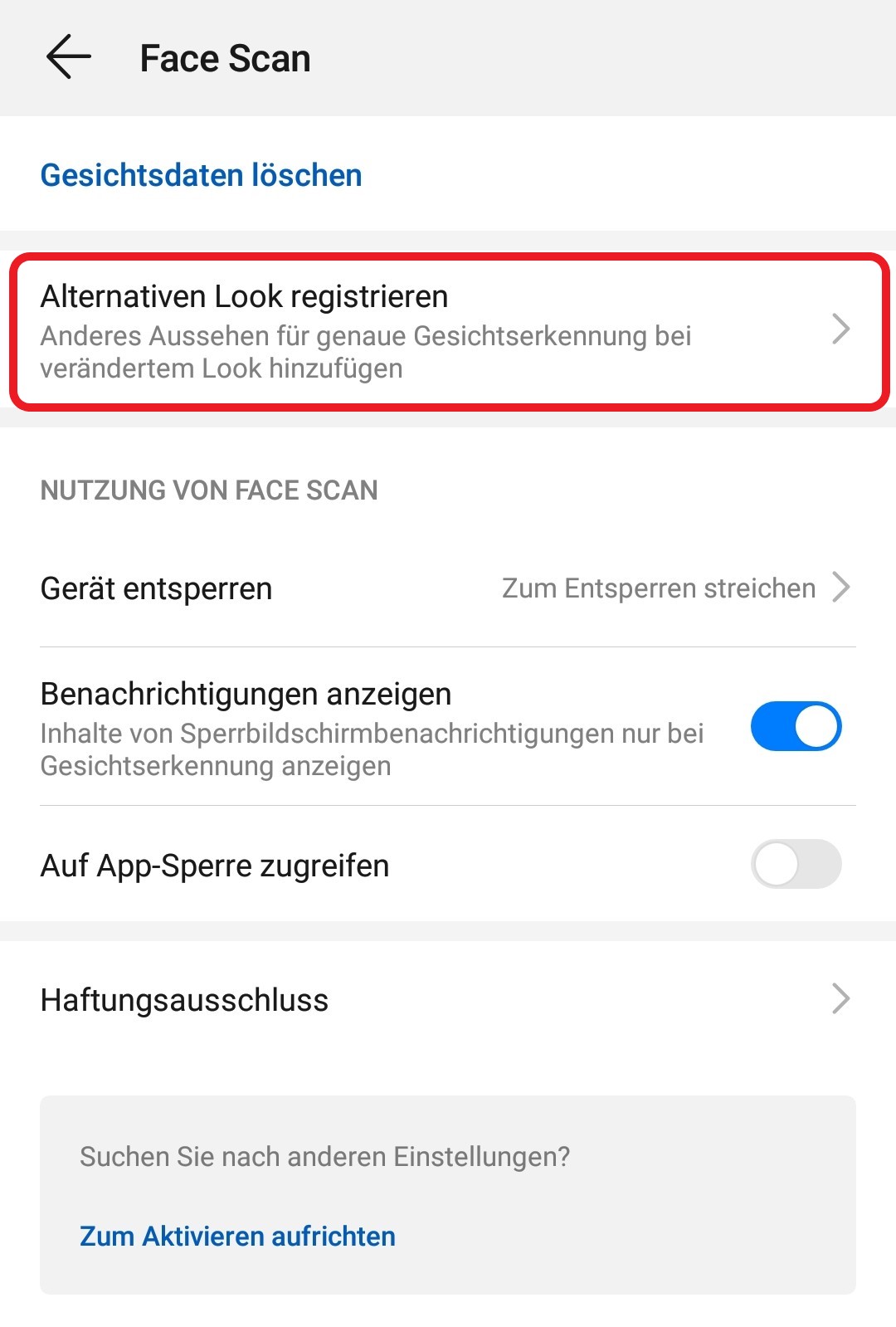 Sicherheit & Datenschutz > Face Scan und tippe auf Alternativen Look registrieren. Hier kannst du einen zusätzlichen Look hinterlegen, indem du dein Gesicht registrierst.