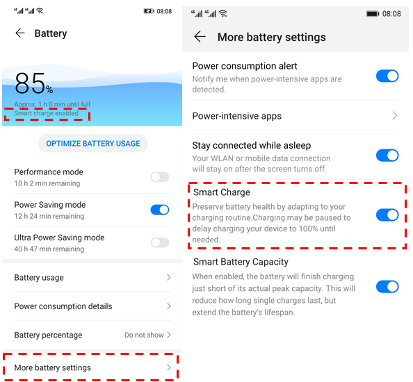 Funktionen Smart Charge und Intelligente Akkuschonung zum Energiesparmodul hinzugefügt. Sie können diese anzeigen, indem Sie zu gehen. Diese Funktionen sind standardmäßig aktiviert, um die Akkualterung effektiv zu verzögern und die Akkulebensdauer zu verlängern. Daher wird empfohlen, diese Funktionen aktiviert zu lassen.