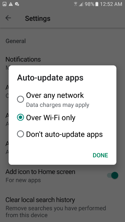 ولهذا تحتاج للتأكد من أن تطبيقاتك لن تقوم بتحديث نفسها إلا عند توفر إتصال بالواي فاي فقط من خلال الذهاب لمتجر جوجل بلاي ثم قائمة وبعدها إعدادات والتحديث التلقائي للتطبيقات واختر التحديث عبر الواي فاي فقط Menu>>Settings >>Auto-update apps >> Auto-update apps over Wi-Fi only.