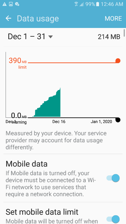 وتستطيع التوجه للإعدادات وبعدها إضغط على استخدام البيانات ثم الفواتير وبعدها الحد من البيانات Settings >> Data Usage>>Billing Cycle>>Data limit and billing cycle، ومن هناك يمكنك تعيين الحد الأقصى لمقدار البيانات الذي تنوي استخدامه في غضون شهر كما تستطيع تفعيل خيار قطع الإتصال التلقائي من الشبكة بمجرد الوصول لهذا الحد.