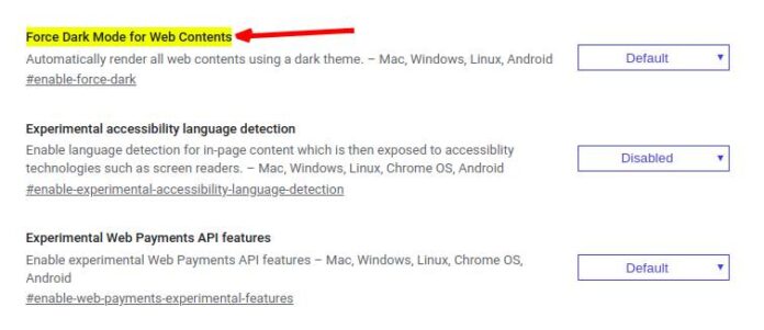 سيتم تحديد “Force Dark Mode for Web Contents”. بدلاً من الافتراضي “default”، اضبطه على ممكّن “enabled” من القائمة المنسدلة.