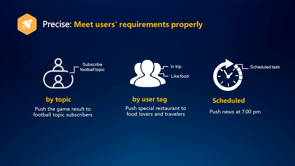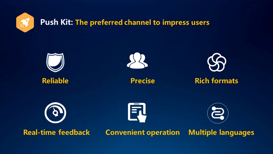 رسائل الدفع لا تصل إلى المستخدمين المستهدفين؟ تلبي Push Kit الاحتياجات المتنوعة للمطورين لمساعدة التطبيقات على إرسال الرسائل إلى المستخدمين بدقة. على سبيل المثال ، يمكنه إرسال أحداث أو رسائل نشاط مختلفة إلى مجموعات مستخدمين محددة بناءً على مواضيع محددة. بالإضافة إلى ذلك ، يمكن أن يرسل رسالة توصية مطعم للمستخدمين الذين يحبون الطعام أو الذين لديهم اقتراح السفر بناء على سلوك المستخدم. من أجل توفير الوقت ، من الممكن تحديد مهام الدفع مسبقًا والدفع تلقائيًا في الوقت المحدد. تسهل Push Kit على المطورين إدارة الأنشطة التشغيلية لتطبيقهم.