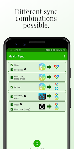 Health Sync هو تطبيق رائع ومفيد بنفس الوقت لحملة أجهزة أندرويد، وسيسمح لهم بمزامنة بيانات اللياقة البدنية الخاصة بهم مع جميع المصادر والخدمات، على سبيل المثال المزامنة مع Google Fit و Samsung Health أو مع Fitbit أو Garmin أو InBody أو Oura Ring أو Polar أو Suunto أو Withings (Health Mate).