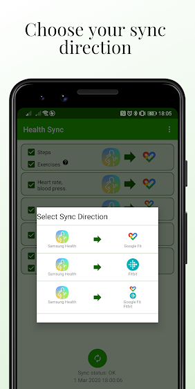 بدوره، تطبيق Health Sync يعمل بشكل تلقائي وسيقوم بمزامنة البيانات في الخلفية من تطبيقات المصدر المختلفة ولأنواع مختلفة من البيانات، مع القدرة على اختيار اتجاه المزامنة والاستفادة من الخيارات المختلفة، على سبيل المثال، يمكنك مزامنة الأنشطة من Garmin إلى Samsung Health ومزامنة البيانات من Fitbit إلى Samsung Health و Google Fit.