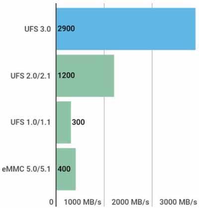 واحدة من الاختلافات الأساسية بين الاثنين هو السرعة فـ . UFS 3.0 لديه ضعف سرعة سابقتها. على الورق ، يبلغ الحد الأقصى لعرض النطاق الترددي للإنتاجية لـ UFS 2.1 1200 ميجابايت / ثانية ، بينما يحتوي UFS 3.0 على نطاق ترددي ضخم يبلغ 2900 ميجابايت / ثانية ، وهو ما يقرب من ضعف سابقته.