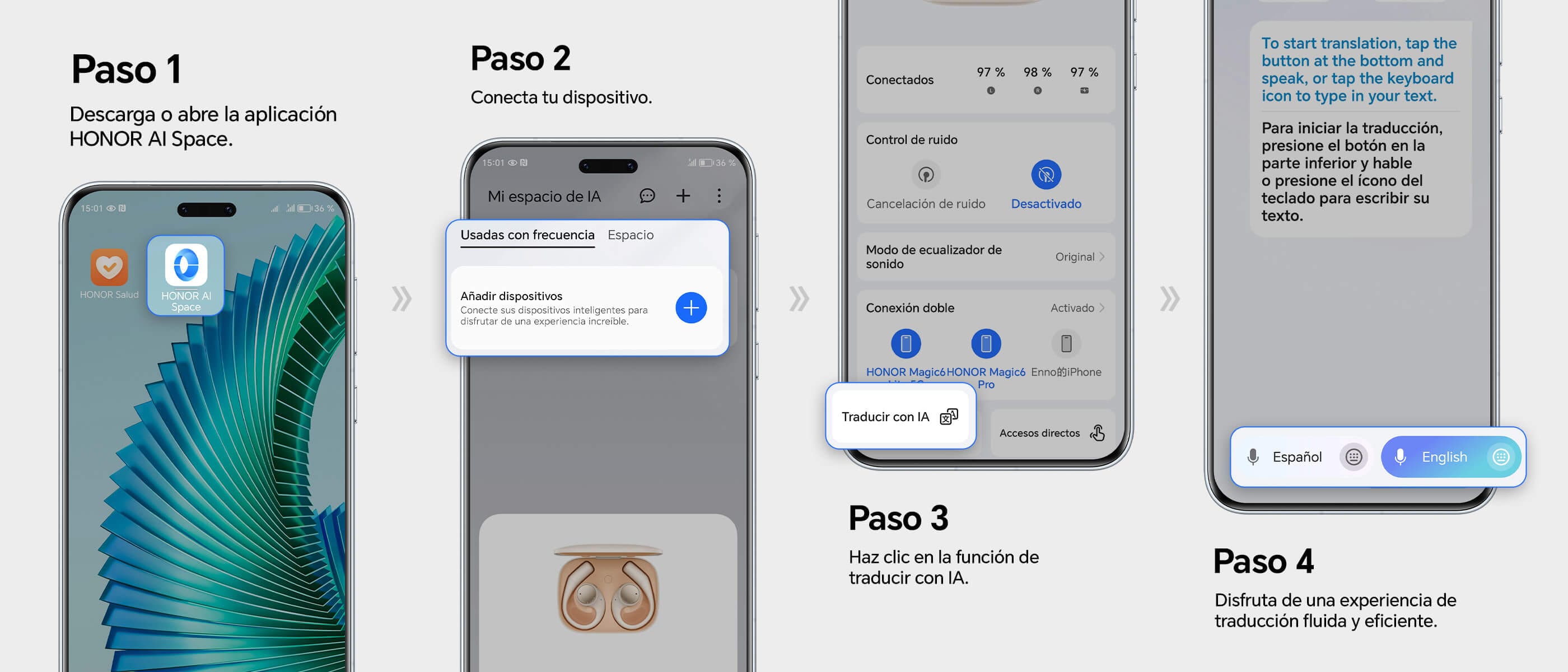 La funcionalidad de traducción puede ser usada a través de la aplicación "HONOR AI Space", la cual está disponible para Android e iOS. Para Android se puede descargar de la Play Store de Google con versión 9.63.02.300 o superior y desde la App Store de Apple con versión 2.5.2.302 o superior. Conecta los auriculares HONOR Earbuds Open y dentro de la aplicación selecciona la opción "Traducir con IA".