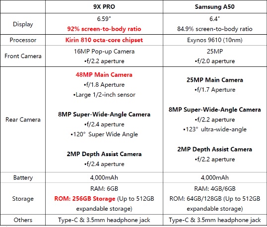Si vemos sólo a estos números, estos dos móviles parecen casi lo mismo. En realidad, gracias al diseño de la cámara emergente, la relación pantalla-cuerpo del HONOR 9X PRO es tan alta como 92%. Como resultado, aunque el tamaño de la pantalla es más grande, aún puede sostener el HONOR 9X PRO con una sola mano fácilmente. Es muy fácil entender lo que significa una alta relación pantalla-cuerpo. Cuanto más grande sea la pantalla, más podrás ver. Puedes ver videos con una pantalla más grande, y puedes tener una vista más grande cuando juegas. Es por eso que el HONOR 9X PRO supera al Samsung A50 en la pantalla. El Samsung A50 tiene una relación pantalla-cuerpo más baja, 84.9%.
