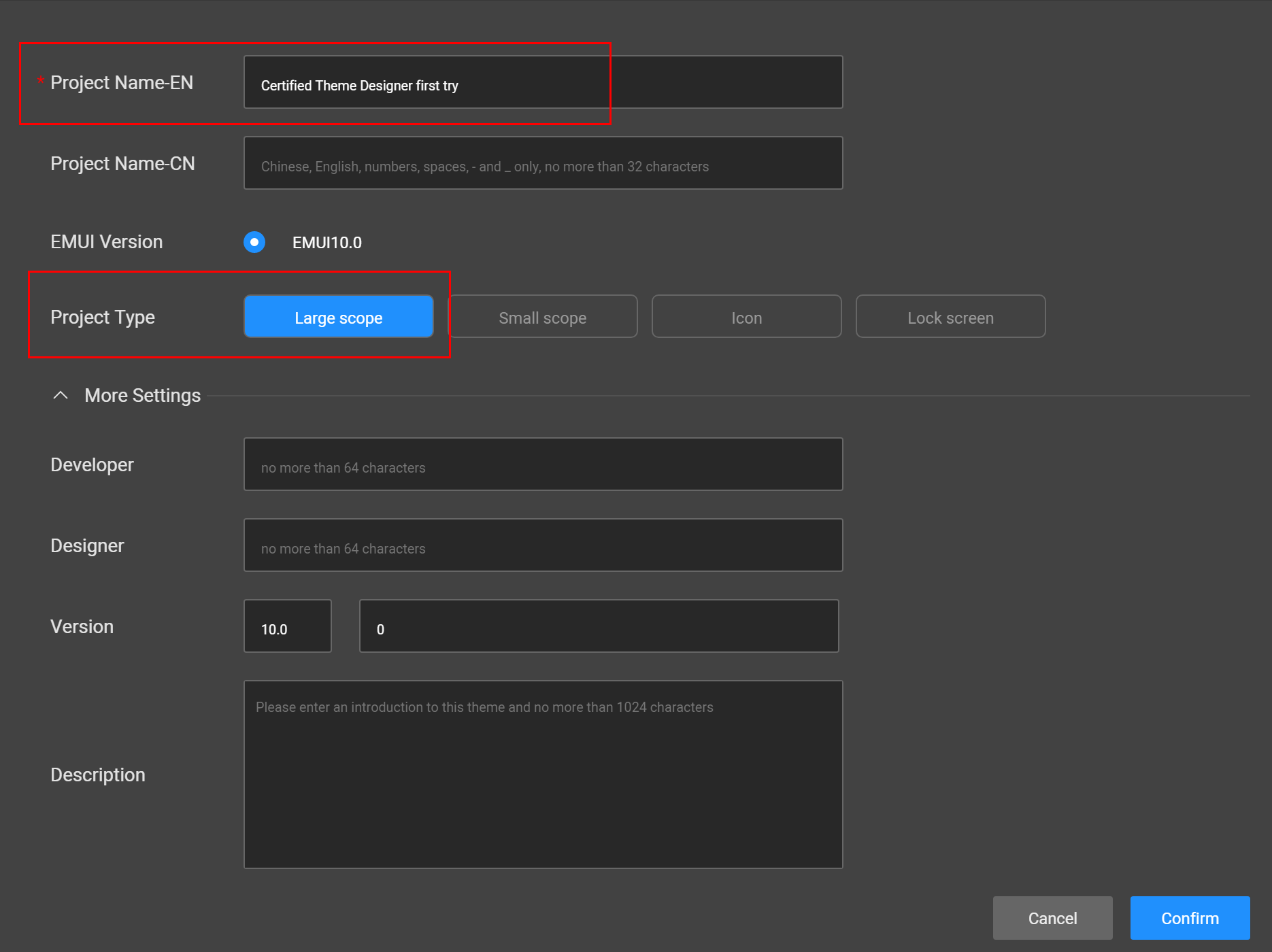 Escribimos rápidamente el título "Diseñador de temas certificado primero intente", luego marca "Alcance grande" y haz clic en el botón confirmar.