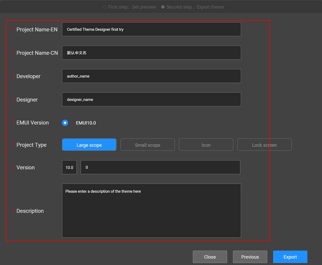 Una vez que haga clic en Siguiente, deberás verificar dos veces el nombre, desarrollador, diseñador, etc. Simplemente puede averiguar qué escribir desde el título. Luego, simplemente puedes presionar "exportar" y elegir la ubicación para obtener tu primer tema.