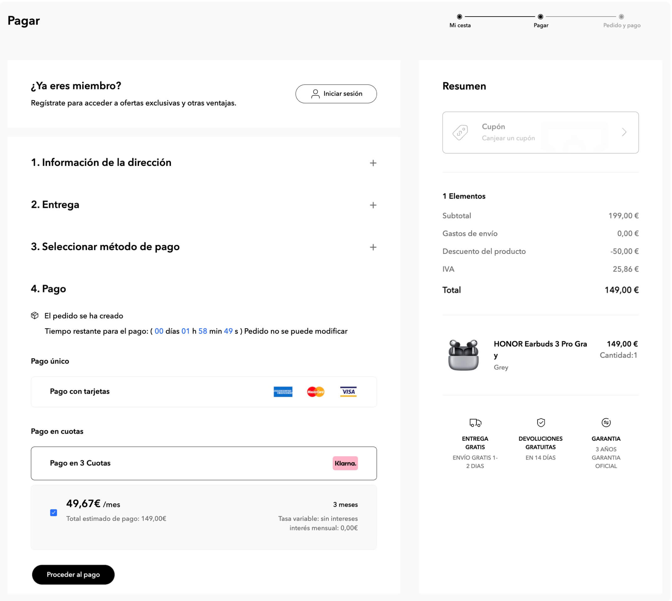 La oferta de financiación queda reservada a particulares y los 3 plazos sin intereses son válidos para los pedidos que cumplan los requisitos por un importe desde 49€ a 800€