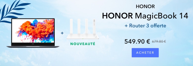 Avec 50€ de réduction sur HONOR MagicBook 14/HONOR MagicBook 15, et 15€ de coupon supplémentaire. Vous l’obtenez à 534,9€ et un HONOR Router 3 est offert gratuit!
