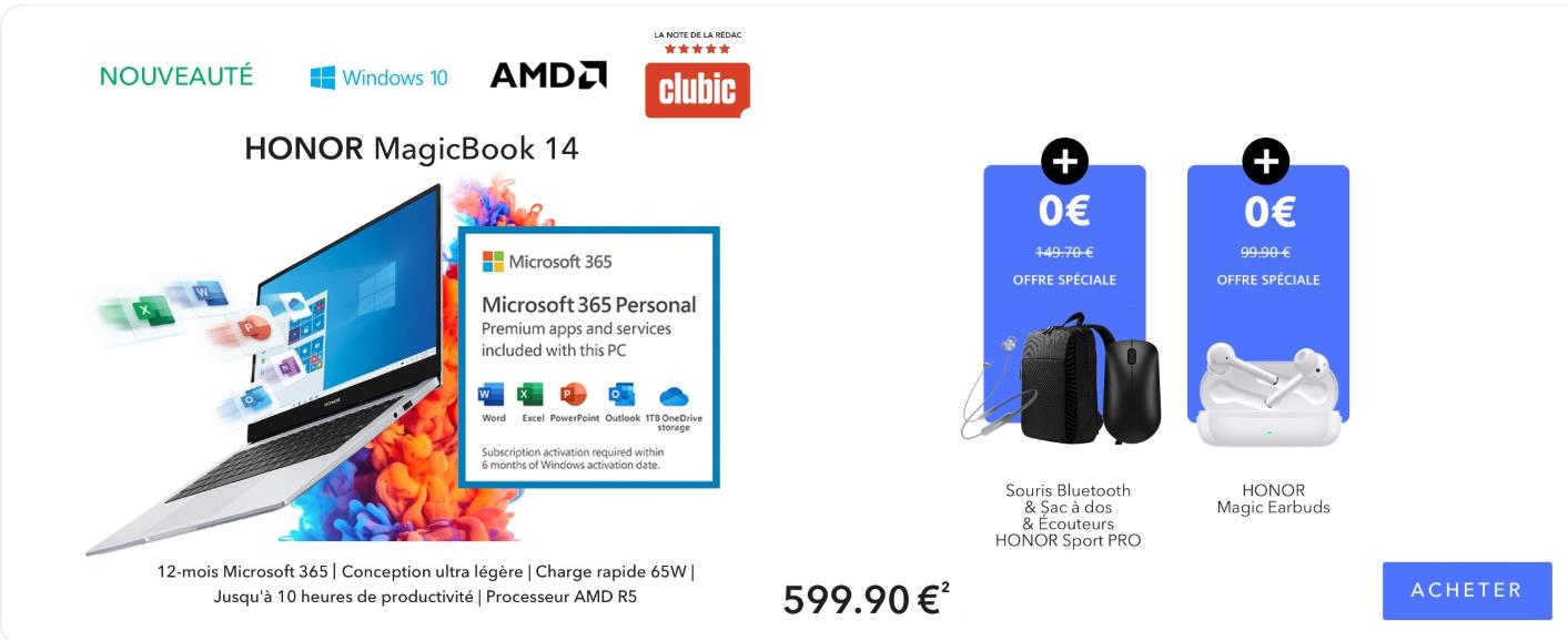 Avec 50€ de réduction sur HONOR MagicBook 14 avec 12 mois d’abonnement au Microsoft365, et 15€ de coupon supplémentaire. Vous l’obtenez à 584,9€