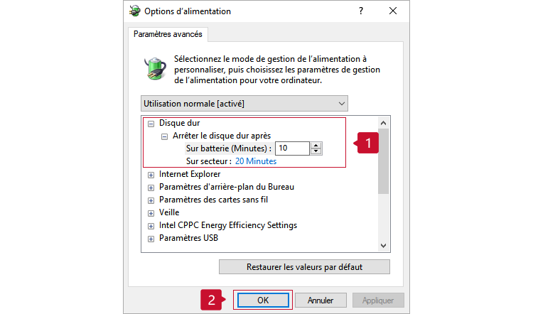 5. Cliquez sur les icônes + à côté de Paramètres USB et Paramètre de suspension sélective USB, désactivez le Paramètre de suspension sélective USB, puis cliquez sur OK. Insérez ensuite à nouveau le périphérique USB.